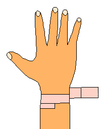 | Débuter en enroulant la bande autour du poignet. | Continuez au-dessus du dos de la main – | et deux ou trois fois autour de la main sur les articulations et puis diagonalement sur le dos de la main et derrière le pouce. |