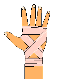 | Autour du bras | et puis la même chose encore autour de la main sur les articulations et sur le dos de la main. | Enfin le strapping est fini avec deux ou trois tours sur le poignet. |